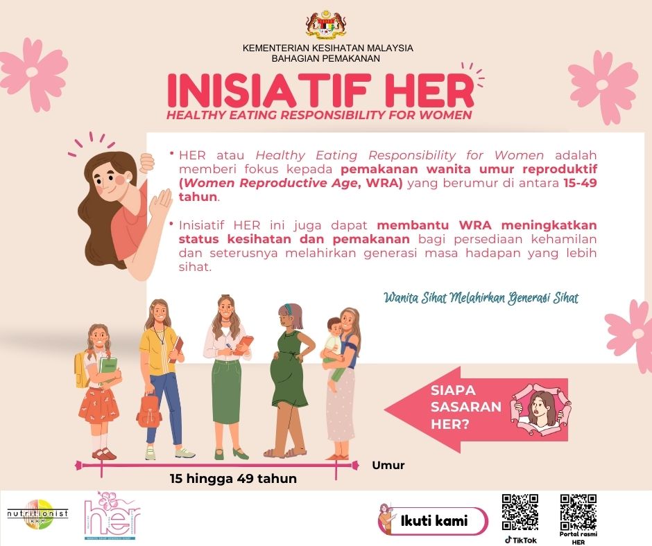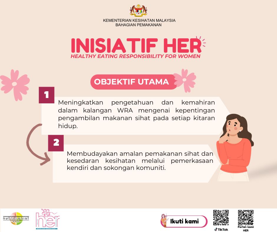 Inisiatif Healthy Eating Responsibility for Women atau HER menyeru wanita untuk lebih mengambil tahu dan bertanggungjawab tentang kesihatan dan pemakanan mereka. Untuk maklumat lanjut sila layari portal rasmi Bahagian Pemakanan di pautan https://hq.moh.gov.my/nutrition/her/ dan ikuti kami di TikTok HER https://vt.tiktok.com/ZSNLeaCq1/