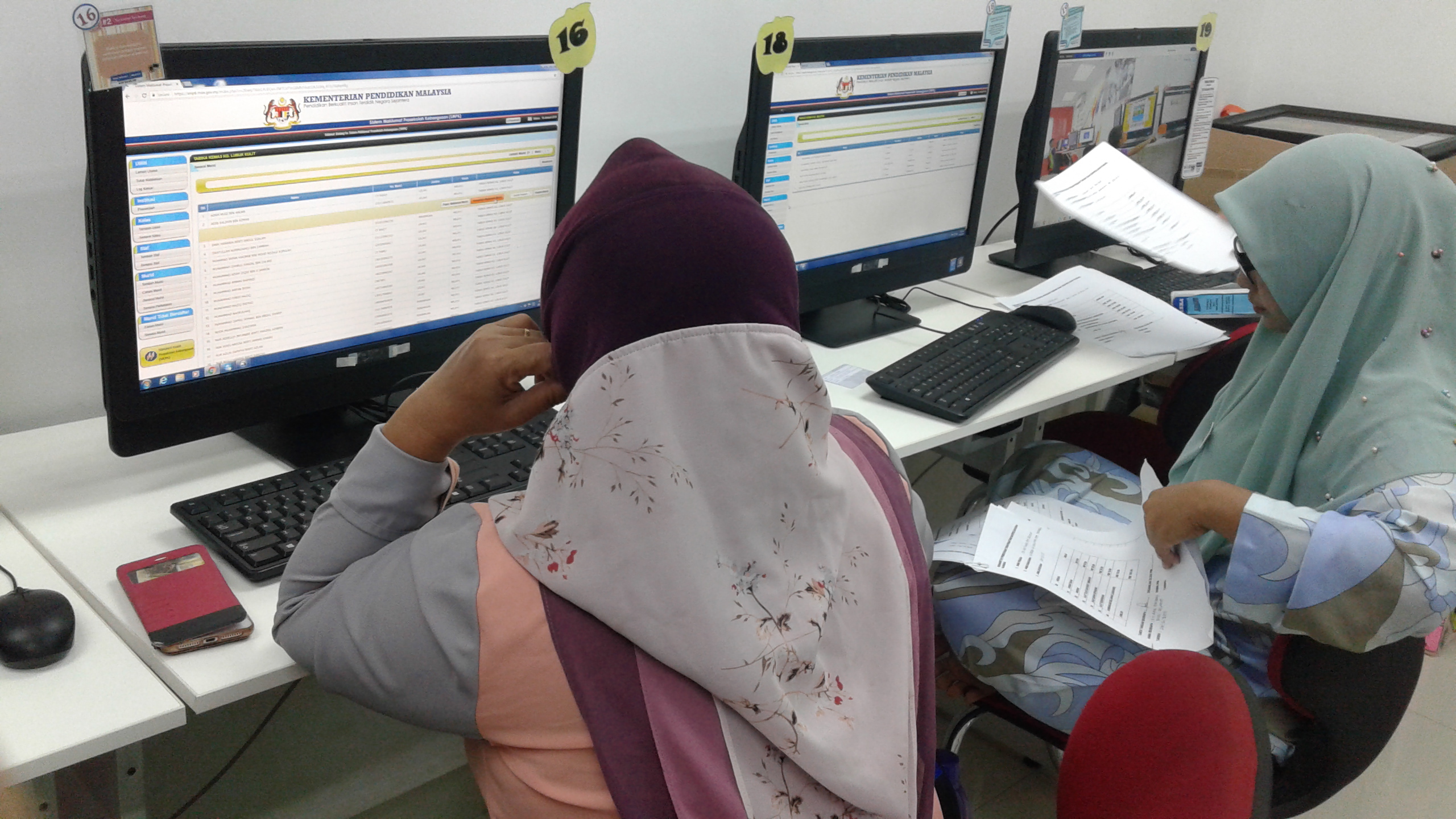 Petugas membantu para guru untuk membuka website dan mengemaskini data para pelajar yang perlu disiapkan.