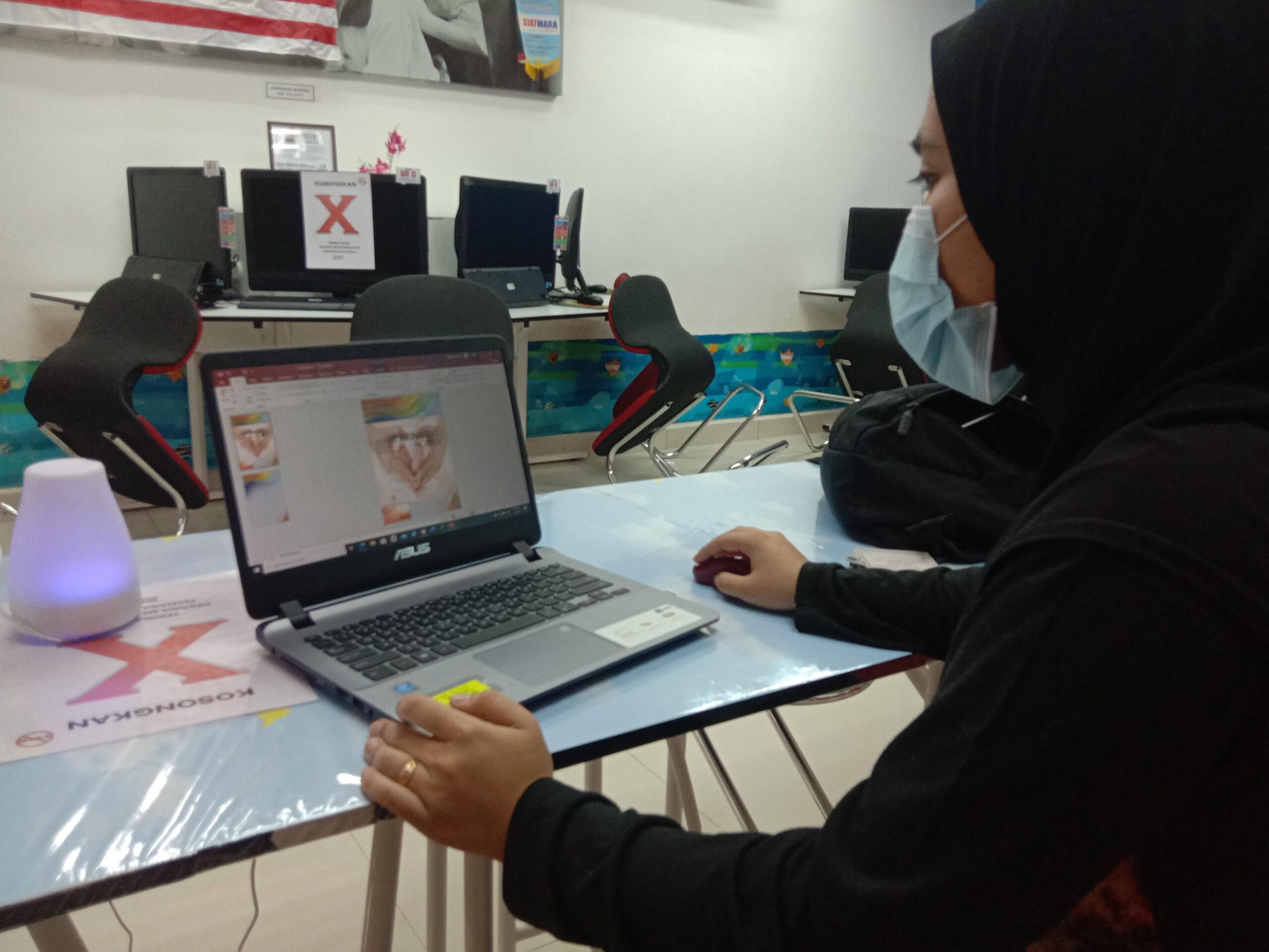 Petugas memberi penerangan cara memasukkan maklumat dengan lebih kemas. Petugas turut membantu peserta untuk menyusun, mengedit maklumat dan gambar untuk nampak flyers lebih menarik.