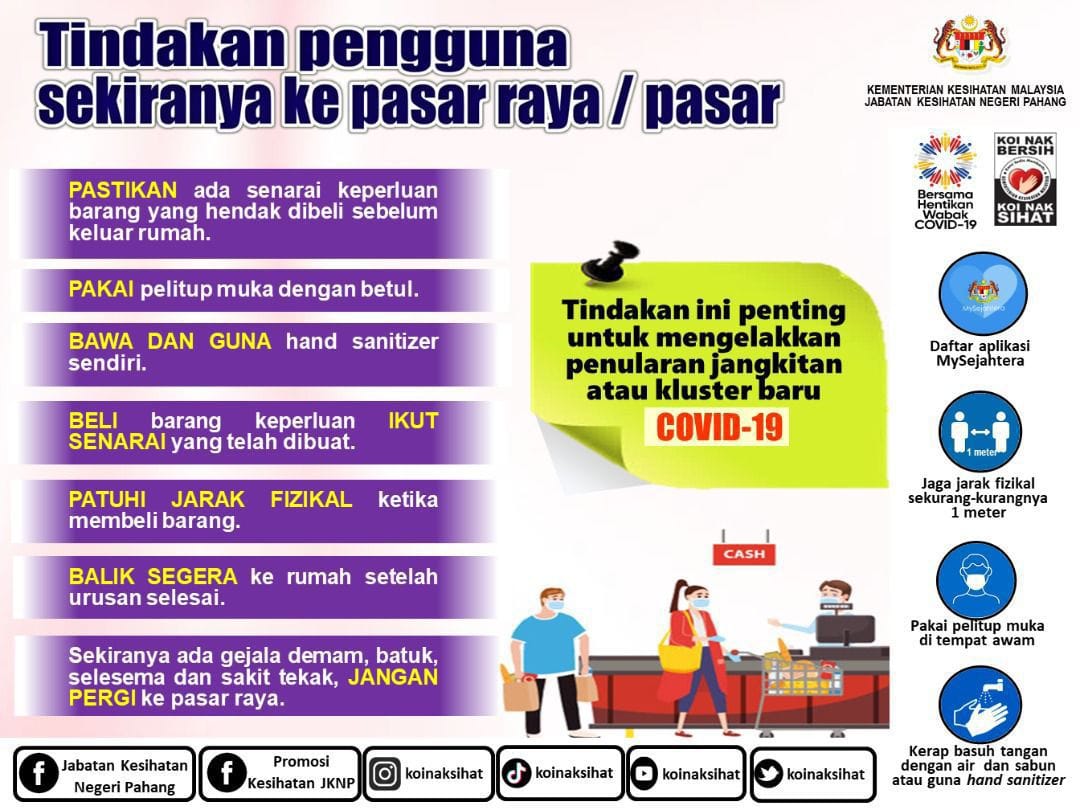 Berikut merupakan langkah keselamatan yang perlu diambil oleh pengguna apabila mengunjungi pasar raya dan pasar untuk mengurangkan risiko daripada dijangkiti virus Covid19.