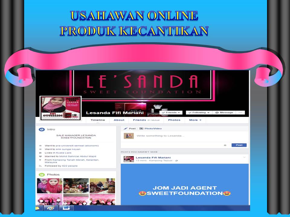 3. Puan Fifi Mariani merupakan suri rumah sepenuh masa pada asalnya. Namun, demi membantu menambahkan lagi pendapatan keluarga, beliau nekad belajar untuk menjadi seorang usahawan online yang berjaya. Beliau mendaftar sebagai agen kepada satu produk kecantikan dan menjual secara langsung dan juga di alam maya.
